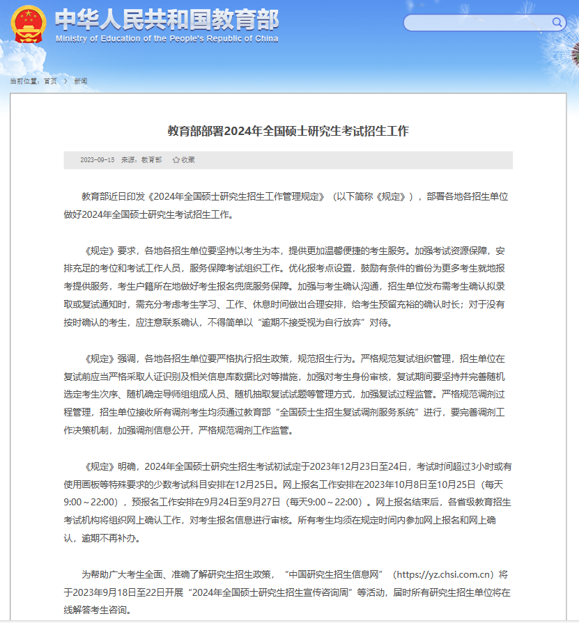 教育部近期印发《2024年全国硕士研究生招生工作管理规定》(以下简称《规定》),部署各地各招生单位实行2024年全国硕士研究生考试招生工作。